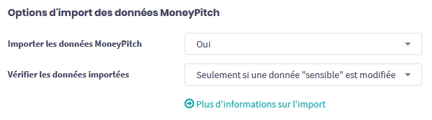 Quand votre client ajoute ou modifie des données dans MoneyPitch, O2S peut récupérer ces informations. Les listes déroulantes Importer les données MoneyPitch et Vérifier les données importées sont importantes car elles vous donnent la possibilité d’activer l’import et, le cas échéant, de choisir la façon avec laquelle vous allez procéder à l’import de ces données.