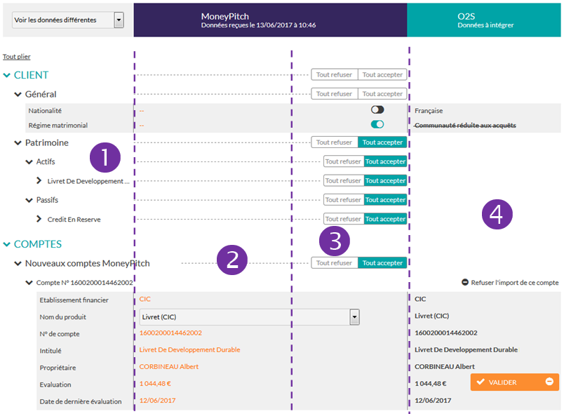 Ici sont affichées les données telles qu’elles seront dans O2S après validation. Si une valeur est en gras, cela signifie que la donnée O2S sera remplacée par celle qui provient de MoneyPitch : vous voyez ici l’impact du choix effectué en Ž. Si elle est barrée, c’est que la donnée n’existe pas dans MoneyPitch et la valeur présente dans O2S sera alors supprimée.