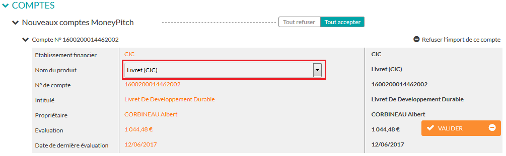 Toutes les données d’un compte sont importées en bloc. Vous pouvez cependant choisir / modifier le Nom du produit dans une liste déroulante qui vous est proposée.