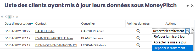 En cliquant sur l’alerte, la fenêtre Liste des clients ayant mis à jour leurs données sous MoneyPitch s’ouvre ; 2 types de traitement sont possibles :