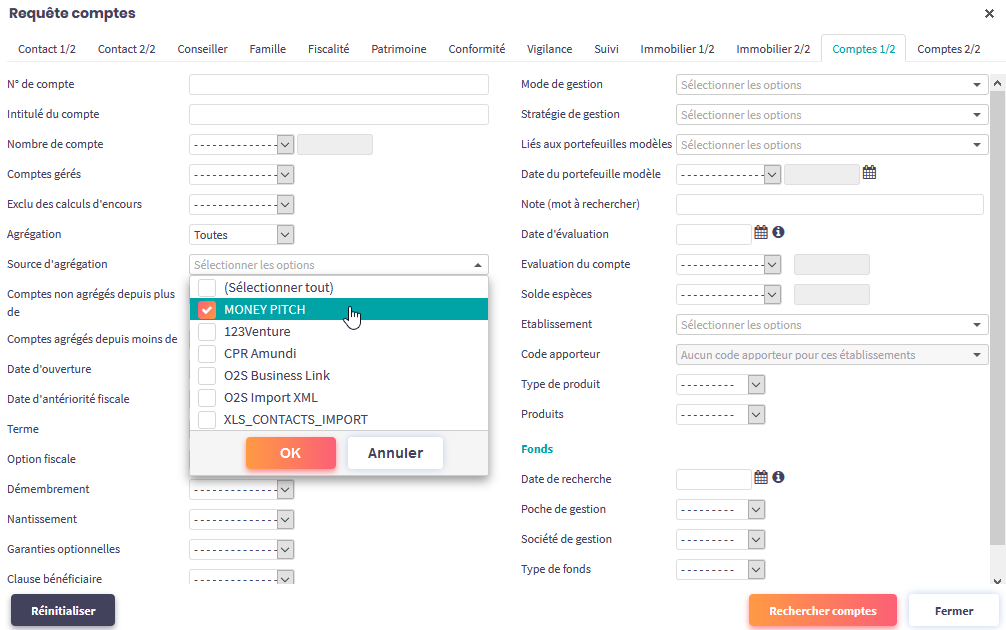 Depuis la page Comptes 1/2, vous pouvez effectuer des requêtes sur la source d’agrégation afin de retrouver les comptes MoneyPitch.