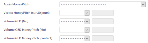 Depuis la page Contact 2/2, vous pouvez lancer des recherches portant sur la présence d’accès à MoneyPitch, sur les visites faites par vos clients dans MoneyPitch, ainsi que sur le volume de GED MoneyPitch.