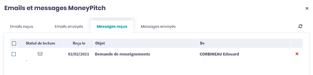 La communication par messagerie interne avec votre client s’effectue depuis la fenêtre d’emails et de messages. Vous recevez ici les messages envoyés par vos clients depuis MoneyPitch.