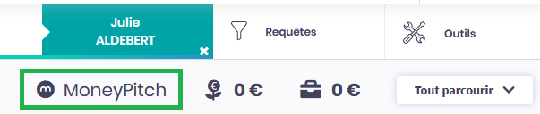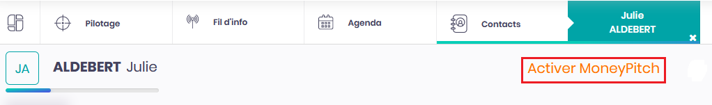 • dans la fiche du client; la mention MoneyPitch apparait en couleur. Cliquez-la pour accéder à la page d’import des données MoneyPitch. Cette notification est mise à jour toutes les 30 secondes.