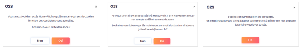 Notez que vous pouvez créer un accès MoneyPitch ou MoneyPitch Premium à votre client lorsque celui-ci a mis à jour ses informations suite à votre demande. Vous récupérez ainsi ses informations dans O2S et à ce même moment vous avez la possibilité de lui créer rapidement un accès.