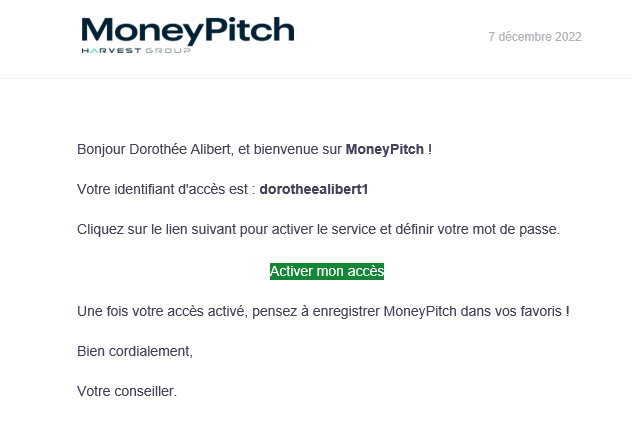 Après avoir cliqué sur Valider, votre client accède à MoneyPitch. Il recevra également un email de confirmation de création de son accès à MoneyPitch.