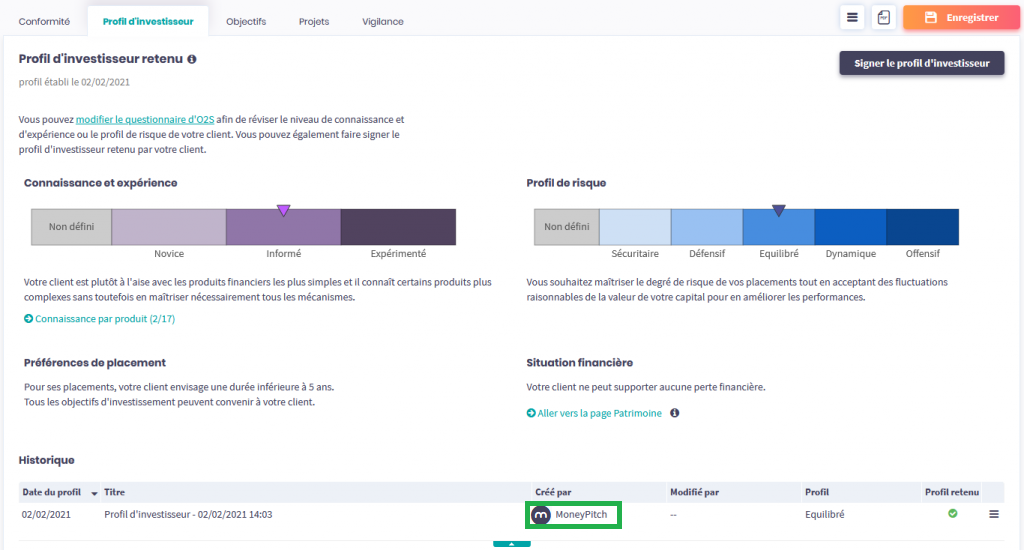 Au niveau du tableau d’historique des profils investisseurs, un questionnaire issu de MoneyPitch est clairement identifiable une fois importé dans O2S.