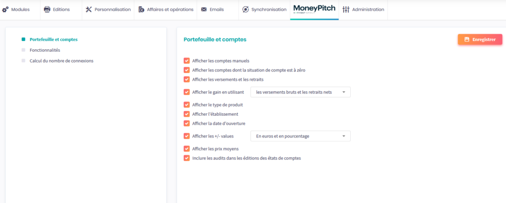 Des options vous permettent de moduler l’affichage de certaines données financières ainsi que la GED MoneyPitch du client.