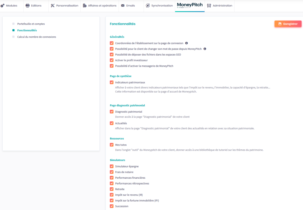 Cochez les cases permettant aux conseillers d’attribuer les différents accès MoneyPitch, et cliquez sur Enregistrer.