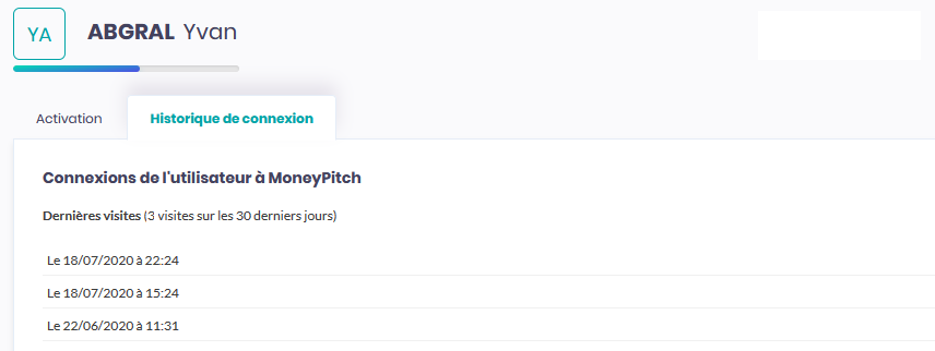 Ce nombre s’affiche dans la page MoneyPitch > Historique de connexion de chaque fiche client. Les jours et heures des connexions sont également précisés :
