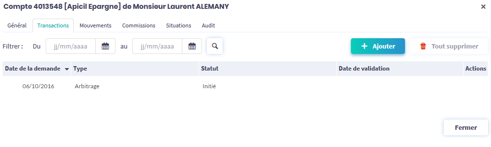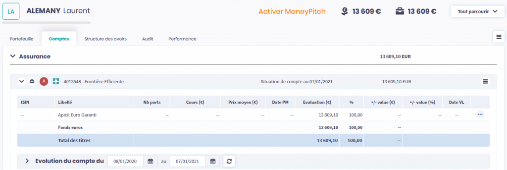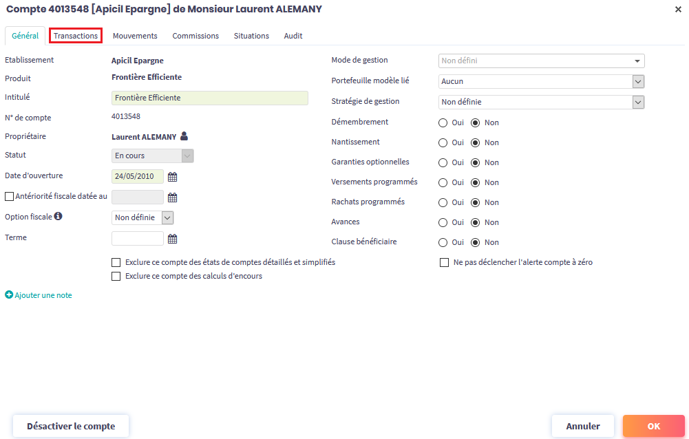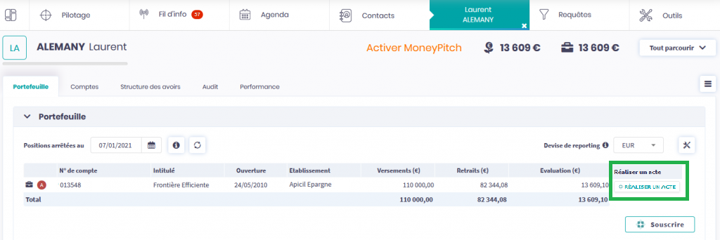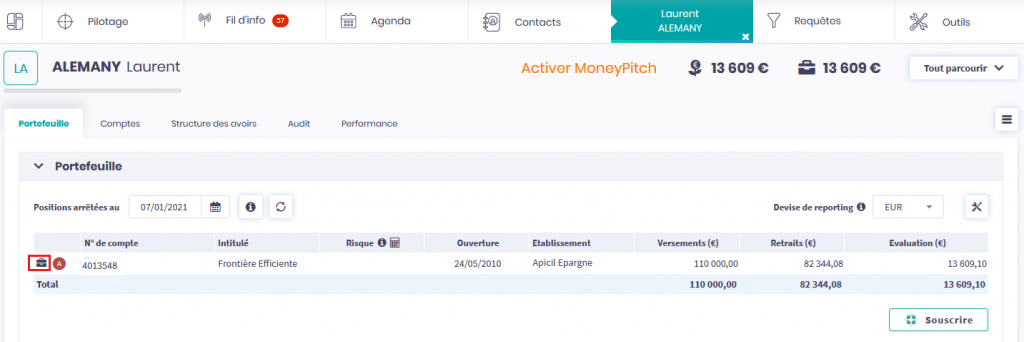 - Dans O2S, allez dans le module Contacts > Portefeuille afin d’afficher le compte APICIL sur lequel vous souhaitez procéder à une transaction.