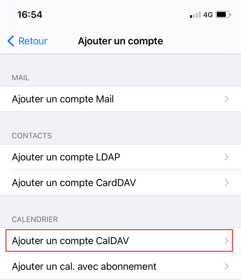 - Dans l’écran qui apparaît, section « Calendrier », cliquez sur Ajouter un compte CalDAV.