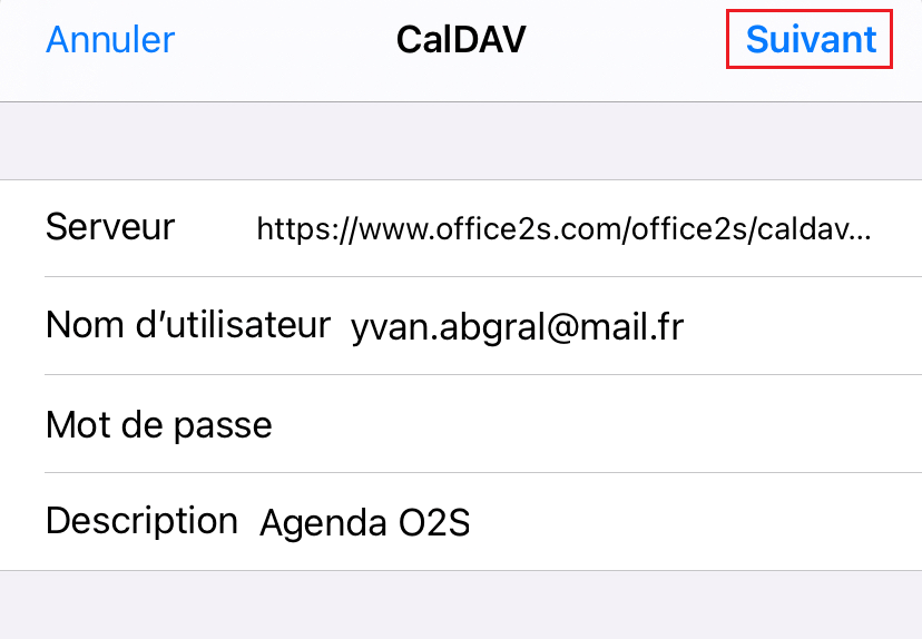 | Serveur | https://www.office2s.com/office2s/caldav.php/calendars/id/o2s (Important : à la place de id vous devez indiquer votre identifiant O2S) |