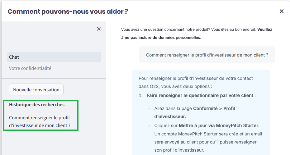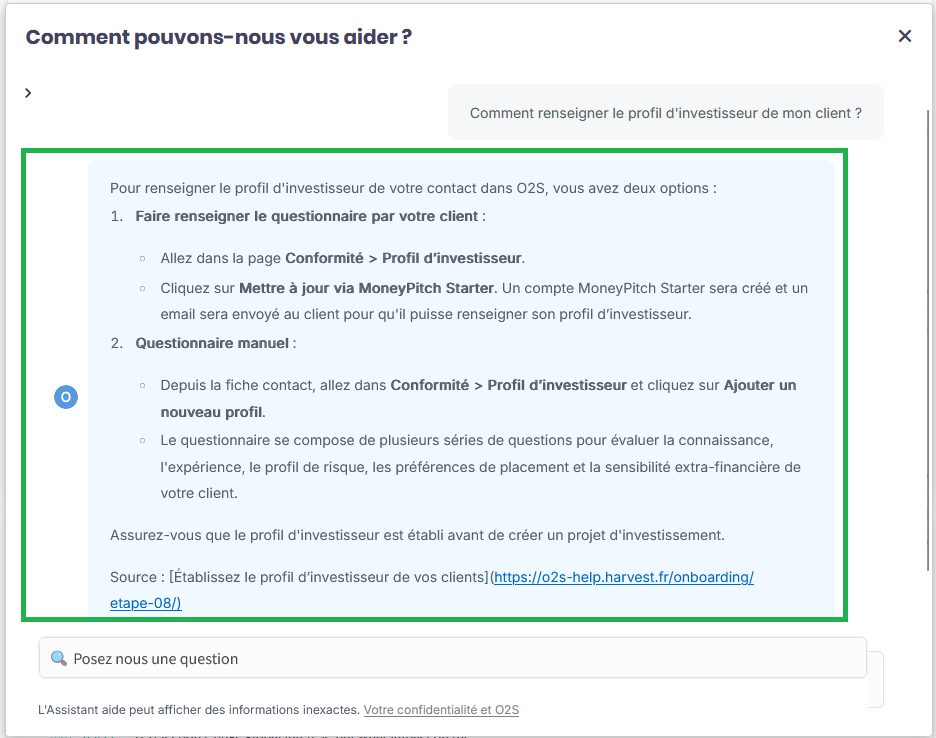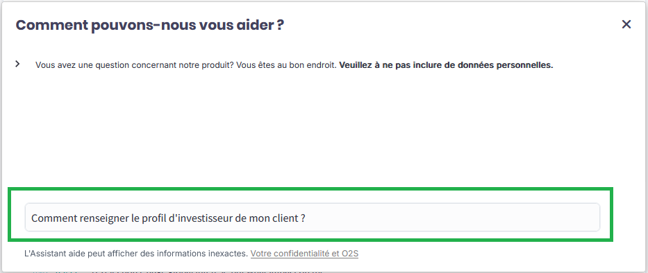 - Saisissez votre question en langage naturel dans la zone « Entrer votre requête », par exemple « Comment renseigner le profil d’investisseur de mon client ? »