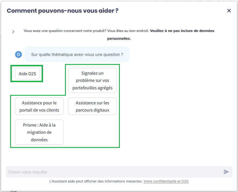 L’Assistant Aide est un outil innovant intégrant l’Intelligence Artificielle (IA) pour répondre à vos questions liées à l’utilisation d’O2S. Avec l’Assistant Aide, votre expérience utilisateur atteint un nouveau niveau de simplicité et d’efficacité, grâce à une solution intelligente s’appuyant sur les dernières avancées en IA pour analyser vos besoins et vous offrir des réponses instantanées et pertinentes.