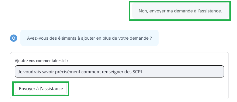 Si vous n’êtes pas satisfait de la réponse de l’assistant, vous avez la possibilité de soumettre votre question directement à l’Assistance O2S en apportant des commentaires
