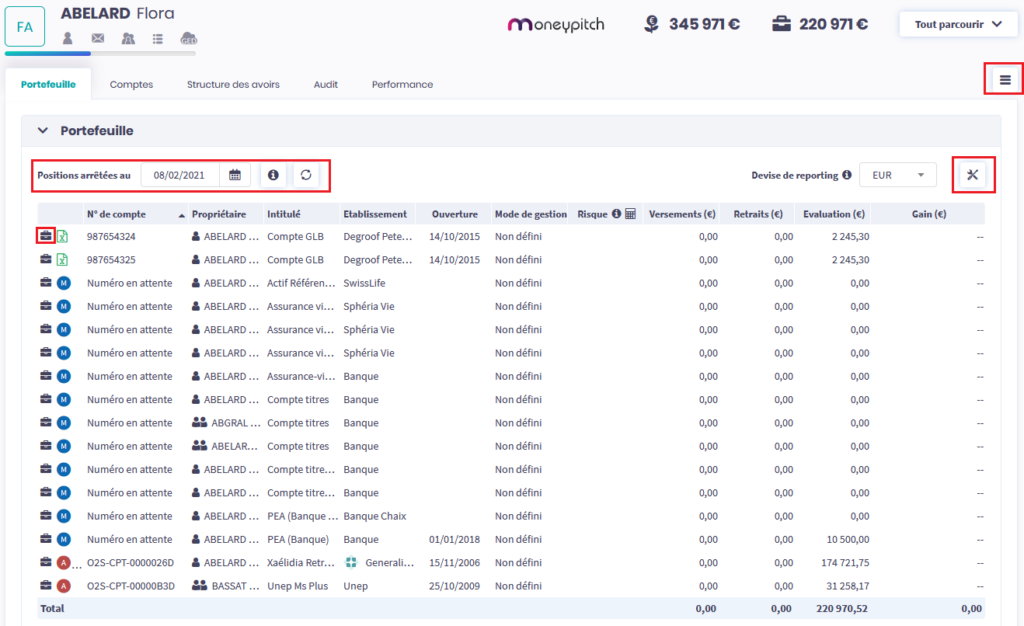 - Tous les supports composant l’ensemble des comptes du portefeuille.