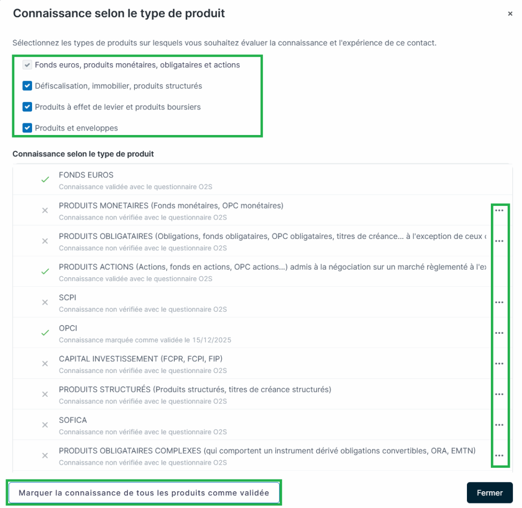 - Modification des types de produit servant à évaluer la connaissance et l’expérience du contact en cliquant sur le lien Connaissance par produit (n/22) qui vous permet :