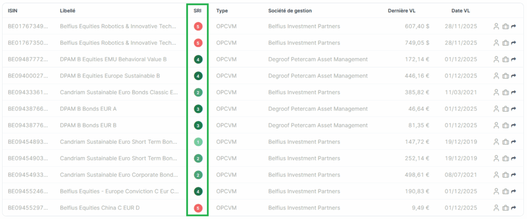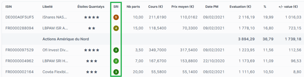 Lorsque vous sélectionnez des fonds, ou dans les fonds constituant un compte ou une allocation, le niveau SRI du fonds est indiqué dans une pastille de couleur :