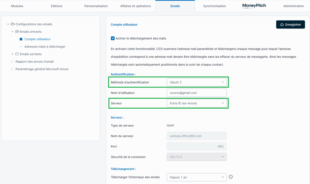 - L’utilisateur réalise son paramétrage dans O2S (authentification OAuth 2, boîte mail, serveur Microsoft Entra ID),