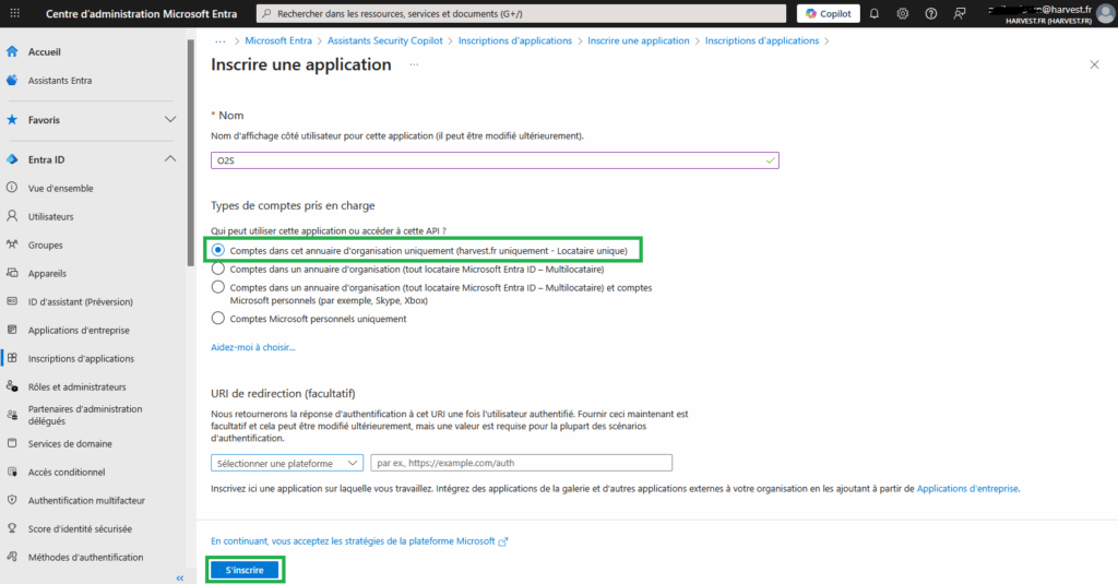Cette étape est essentielle si vos utilisateurs utilisent une adresse mail professionnelle. Vous devez effectuer un paramétrage dans Microsoft Entra ID, puis dans O2S afin qu’ils puissent continuer à synchroniser leurs courriers Outlook dans O2S.