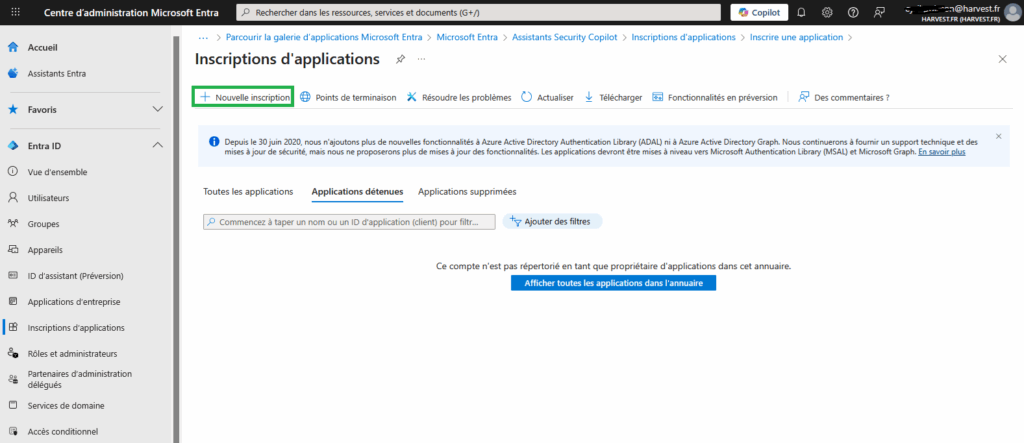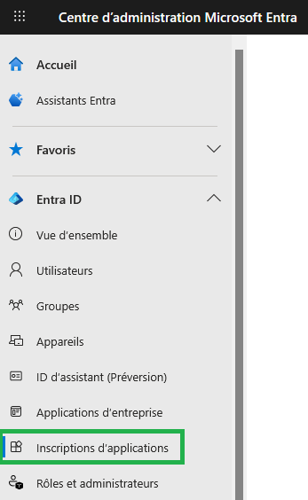 - Dans le menu de gauche, sélectionnez Entra ID > Inscriptions d’applications.