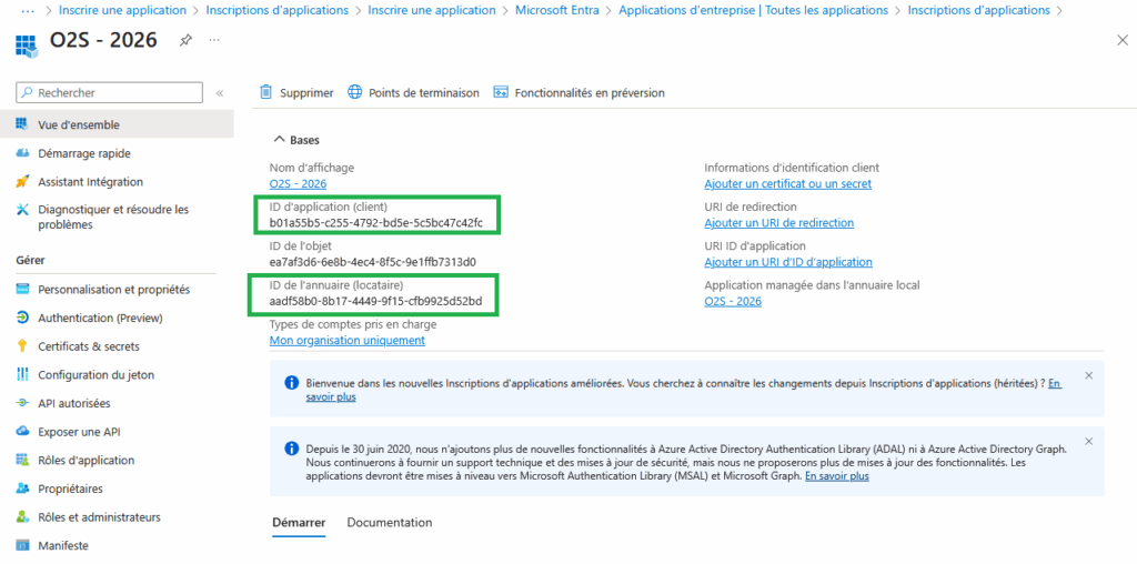 - Notez bien l’ID d’application (client) et l’ID de l’annuaire (locataire) affichés : vous devrez les reporter dans O2S. Attention : ne pas utiliser ces ID qui ne sont ici que des exemples, vous devez utiliser les ID affichés dans votre portail Microsoft Entra ID.