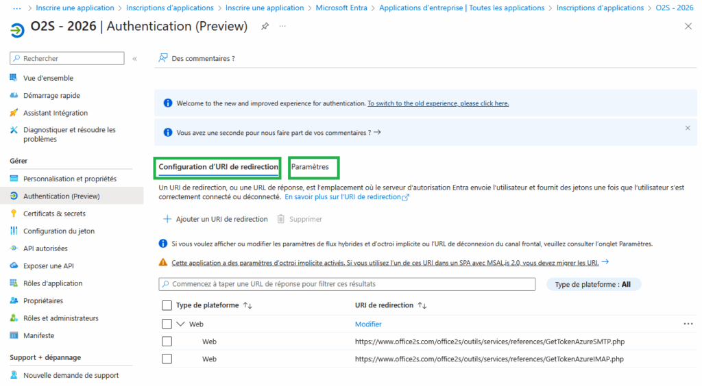 https://www.office2s.com/office2s/outils/services/references/GetTokenAzureSMTP.php - Dans l’onglet Paramètres, cochez les case jetons permettant l’octroi implicite (cases jetons d’accès et Jetons d’ID) conformément à la documentation Microsoft (si présent).