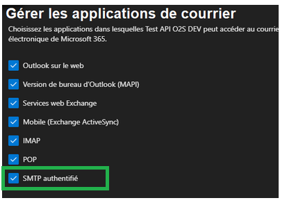 Dans Office 365, l’option permettant à un utilisateur d’utiliser le protocole SMTP doit être activée pour cet utilisateur :