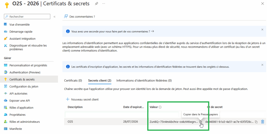 - Toujours dans la page Entra de l’application O2S, allez dans Gérer > Certificats & secrets.