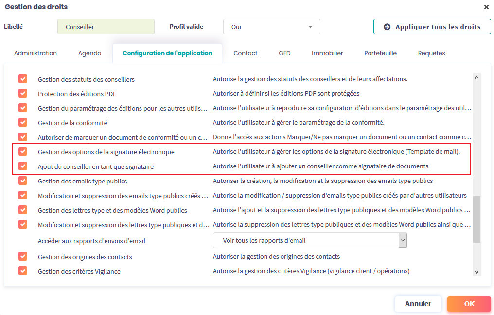Les droits de Gestion des options de la signature électronique permettent d’une part, de personnaliser les mails qui seront échangés avec le client lors du processus de signature électronique, et d’autre part, d’autoriser un utilisateur à ajouter un conseiller comme signataire de documents.