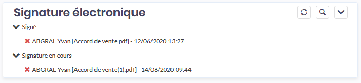 Celles-ci s’affichent dans l’encart Signature électronique du module Accueil. En les cliquant, vous accédez directement au suivi de la signature.