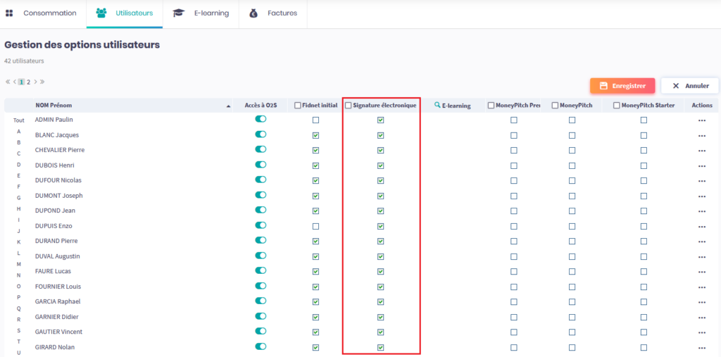 Enfin, pour chaque collaborateur, vous pouvez décider si la signature électronique pourra être utilisée comme moyen de signature par le client. Pour ce faire, rendez-vous dans l’Espace Abonnement > Utilisateurs, cliquez sur Modifier, puis cochez les cases des utilisateurs auxquels vous souhaitez accorder cette fonctionnalité.