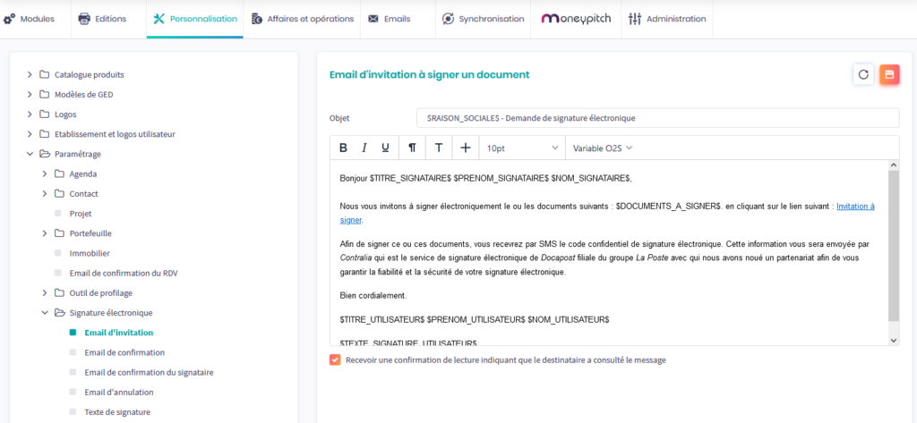 Vous avez également la possibilité de personnaliser les mails qui sont envoyés à vos clients en vue de les inviter à signer, de leur confirmer leur signature et de leur signifier l’annulation d’une demande de signature. Depuis Services > Personnalisation > Paramétrage > Signature électronique, des pages vous permettent de composer et mettre en forme le texte de vos messages.