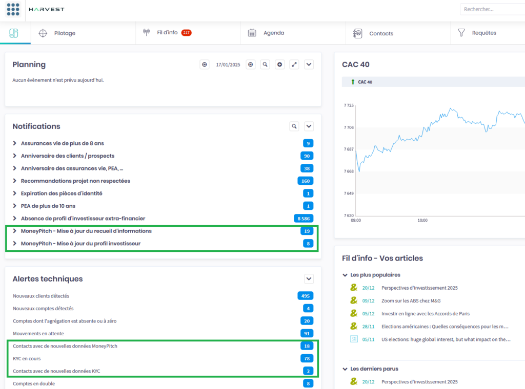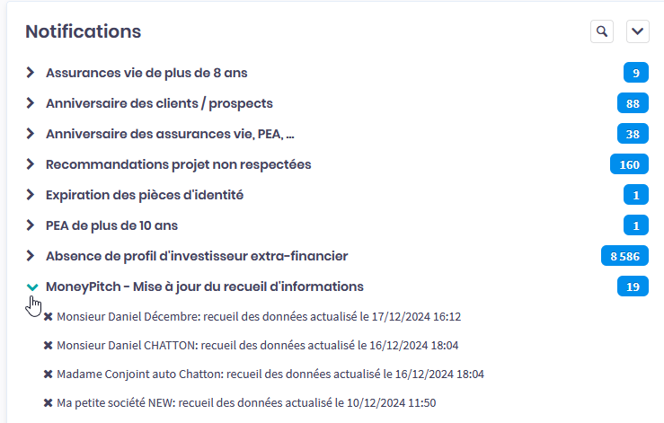| Contacts avec de nouvelles données MoneyPitch | Clients disposant de MoneyPitch (ou MoneyPitch Premium) ayant modifié des données dans leur MoneyPitch (ou MoneyPitch Premium). Note : cette alerte est aussi matérialisée via l’icône « cloche » en haut de la fenêtre d’O2S |
