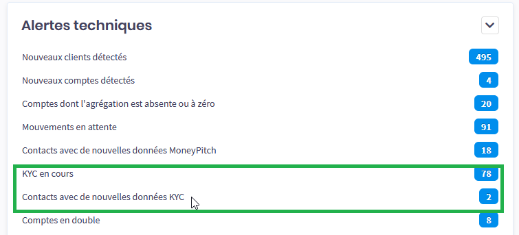 | KYC en cours | Clients disposant d’un KYC en cours. Note : cet indicateur ne tient pas compte des clients possédant MoneyPitch (ou MoneyPitch Premium) disposant également d’un KYC en cours. |