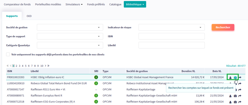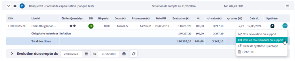 Depuis l’onglet Portefeuille > Comptes du client, pour un même compte, il est possible de visualiser tous les mouvements associés à un support sélectionné. Pour cela, il suffit de cliquer sur > Voir les mouvements du support à droite de la ligne du support.