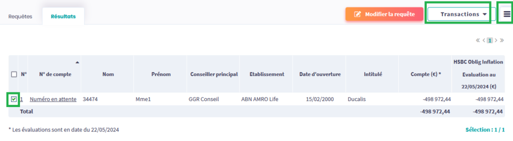 Instantanément, l’écran « Résultats » du module Requêtes s’ouvre et affiche la liste des contacts ou comptes concernés. Vous pouvez alors, par exemple, via le menu Transactions ou réaliser une opération sur tous les contacts ou comptes que vous cocherez.