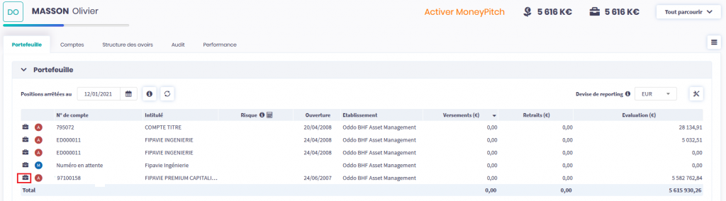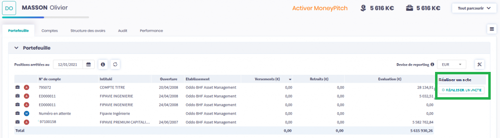 - Dans O2S, allez dans le module Contacts > Portefeuille afin d’afficher le compte Oddo sur lequel vous souhaitez réaliser une transaction.