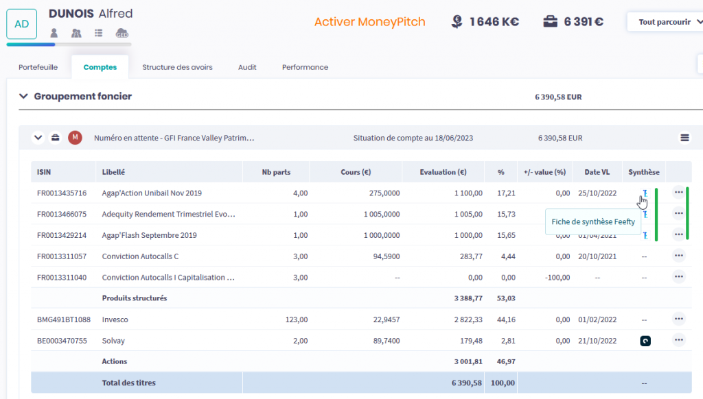 Dans les comptes de vos clients comportant des fonds du type produit structuré, un logo Feefty (matérialisé par un F bleu) est présent dans la colonne Synthèse si les fonds sont à la fois présents dans la base O2S et dans la base Feefty. Les logos sont présents par défaut, vous pouvez cependant les désactiver en vous rendant dans Services > Modules > Portefeuille > Composition du tableau de compte > Fiche de synthèse. Notez que, même si ces logos sont désactivés, vous disposez d’un accès à ces fiches dans le menu (3 points horizontaux)