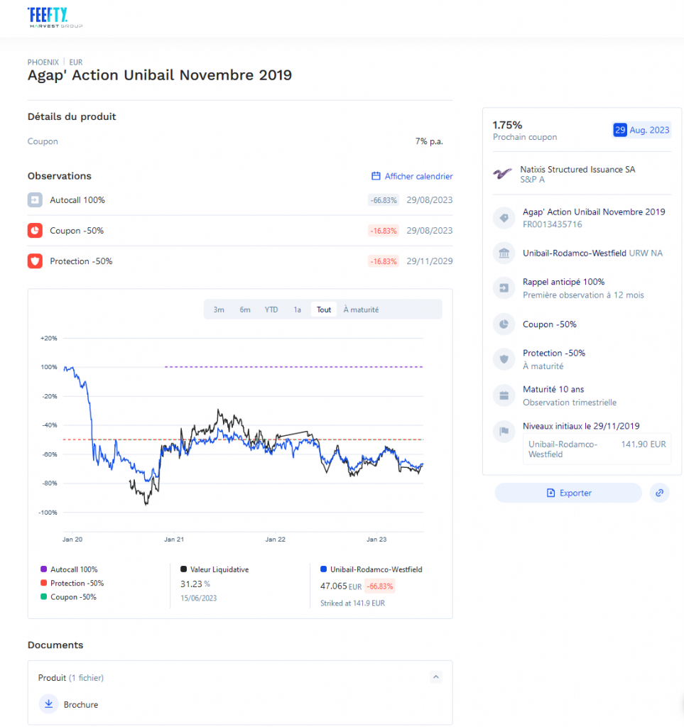 Cliquez sur le logo Feefty (F bleu) : la fiche de synthèse qui s’affiche vous fournit de nombreux indicateurs alliant fiabilité et précision, notamment les courbes d’évolution du sous-jacent (en bleu), et de la valeur liquidative de l’investissement (en noir), des indicateurs permettant ainsi de se projeter sur le potentiel remboursement de ce produit.