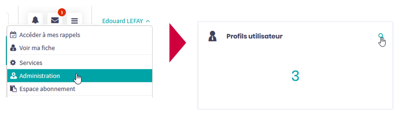 - les utilisateurs disposant du droit de gestion des opérations commerciales (création, suppression, modification). Cliquez sur votre menu Utilisateur, puis sur Administration et Profils utilisateur.