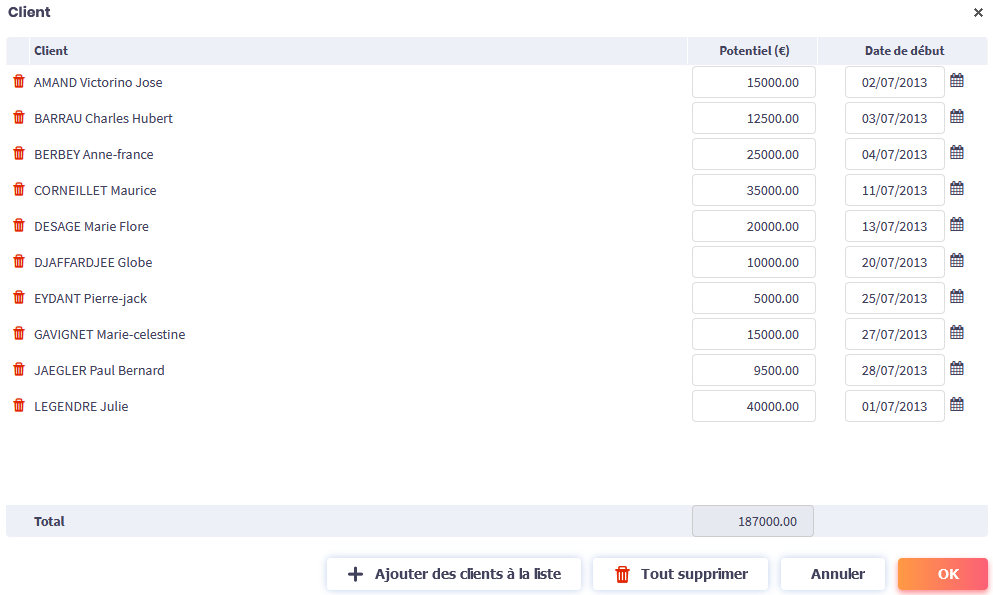 Pour chacun des clients, vous pouvez saisir un montant qui représente le potentiel (investissement que le client peut potentiellement réaliser dans le cadre de l’opération commerciale) ainsi que la date à partir de laquelle le client entre dans la campagne commerciale. Ceci permet donc au conseiller de répartir ses actions (contacts, rendez-vous, etc. prévus dans les étapes de l’opération commerciale) auprès de ses clients sur toute la durée de l’opération commerciale.