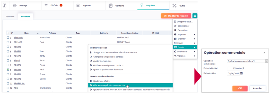 En plus de la sélection des clients au moment de la création de l’opération commerciale, il existe 2 autres façons d’affecter une opération commerciale à des clients, une fois que cette dernière a été créée :
