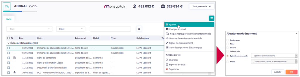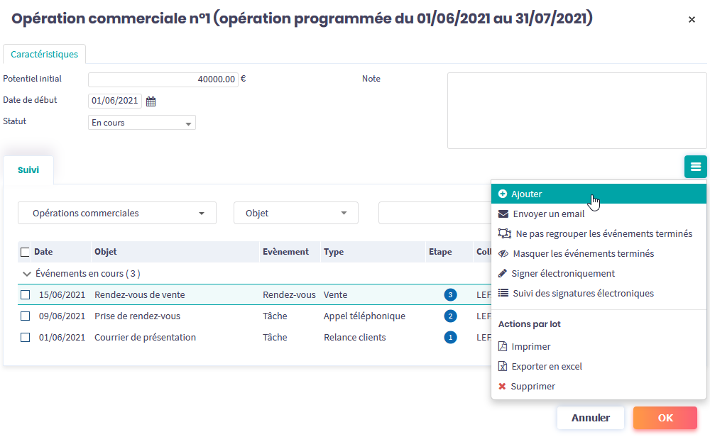 De plus un conseiller à la possibilité de renseigner des évènements (rendez-vous, tâches…) qu’il a accomplis dans le cadre de l’opération commerciale mais qui n’étaient pas prévus en tant qu’étape. Par exemple, le client demande à refaire l’étape « Rendez-vous de présentation » car lors de ce rendez-vous son conjoint n’était pas présent. Dans ce cas, le conseiller peut indiquer qu’il a effectué un rendez-vous avant d’indiquer qu’il va faire ou qu’il a fait l’étape « Rendez-vous de présentation ».