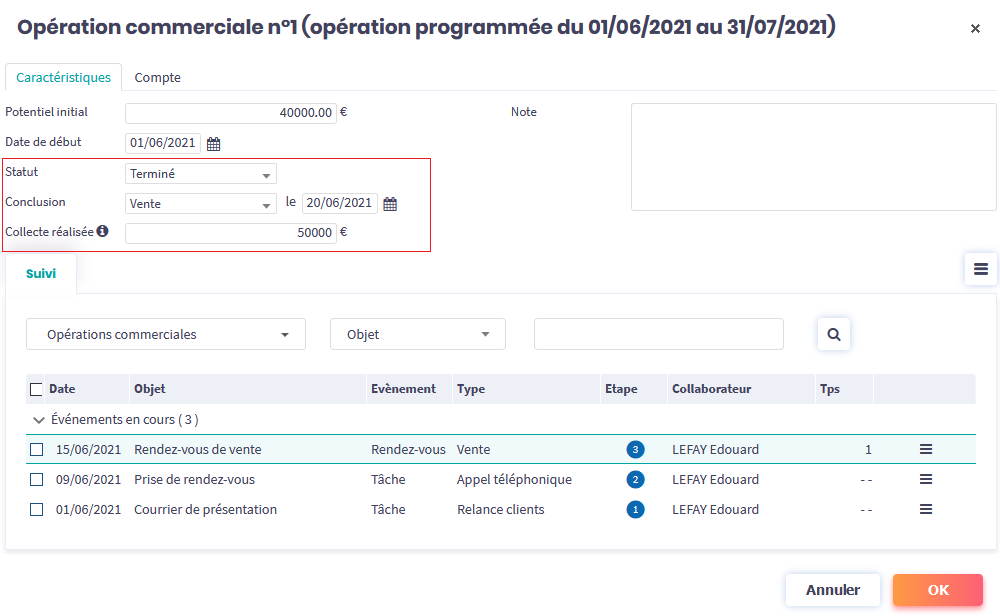 Lorsque la dernière étape (ou bien l’étape représentant la vente) est terminée, vous devez passer le statut de l’opération commerciale pour ce client à « Terminé », puis dans les zones de saisie qui apparaissent, précisez la conclusion, la date à laquelle elle est intervenue, si l’opération commerciale a été couronnée de succès, et le montant de la collecte réalisé, c’est-à-dire la somme d’argent que le client a investi dans l’opération.