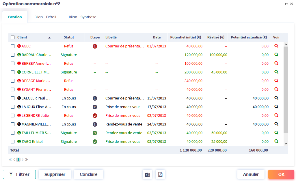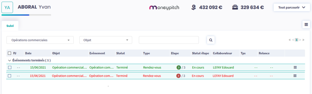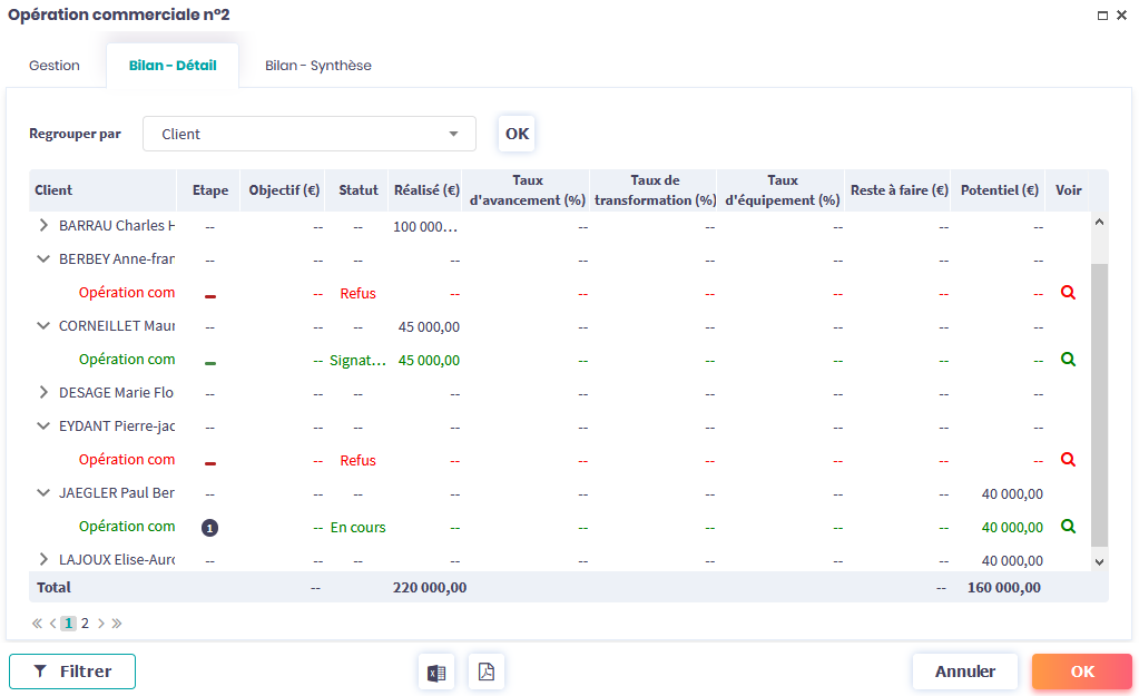 Cet onglet permet d’affiner la vision de l’avancement des opérations commerciales, en ayant la possibilité de les trier par opération commerciale, par conseiller ou bien par client.