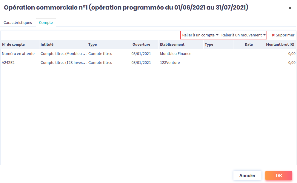 L’onglet Compte n’apparaît que lorsque l’opération commerciale sur le client s’est terminée par un succès (vente ou signature). Grâce à lui, vous pouvez relier une opération commerciale à un ou plusieurs comptes ou mouvements qui correspondent à l’opération comptable effectuée suite à la signature / vente du contrat.