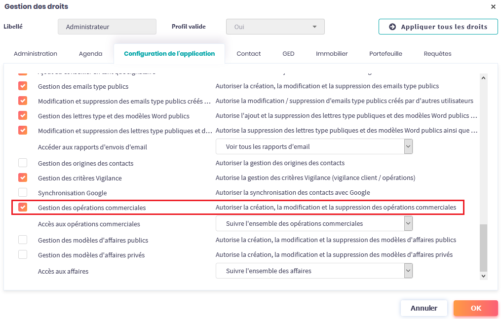 Cette fonctionnalité est réservée aux utilisateurs disposant du droit spécifique « Gestion des opérations commerciales » dans le module Administration.