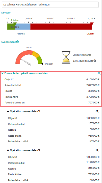 Ce graphe vous permet de connaitre le montant actuellement collecté, l’objectif assigné à l’opération et la collecte potentielle pour les clients qui n’ont pas terminé l’opération commerciale.